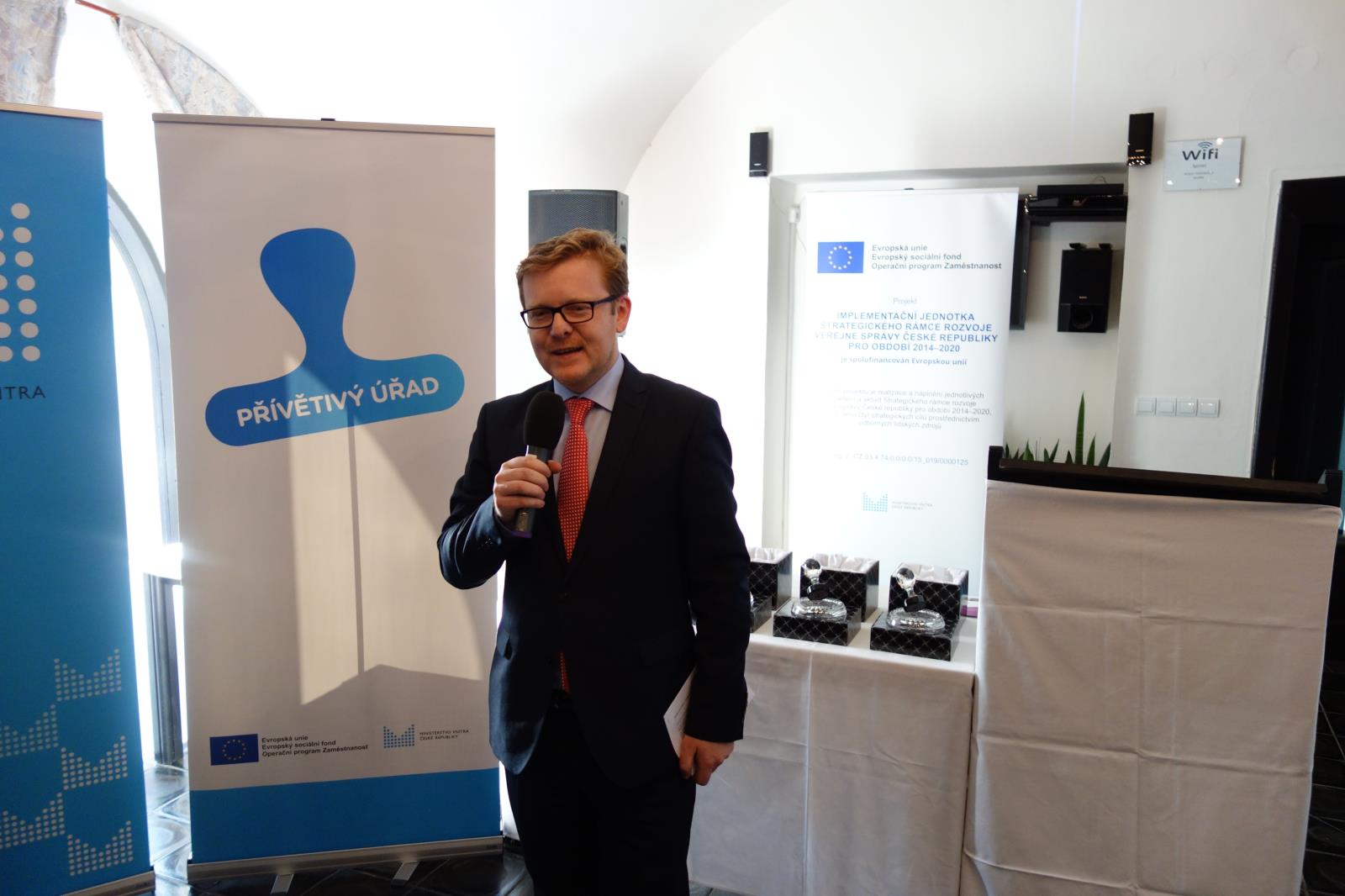 01. Trofeje pro tři nejpřívětivější úřady.JPG 02. Detail trofeje.JPG 03. Publikace příkladů dobré praxe.JPG 04. Náměstek ministra vnitra JUDr. PhDr. Petr Mlsna, Ph.D..JPG 05. Křest publikace příkladů dobré praxe - náměstek Petr Mlsna a ředitel odboru David Sláma.JPG 06. Ing. Mgr. David Sláma, ředitel OSK MV ČR představuje výsledky průzkumu přívětivosti úřadů.JPG 07. O materiály MV byl značný zájem.JPG 08. Vítězové v Karlovarském kraj - Horní Slavkov.JPG