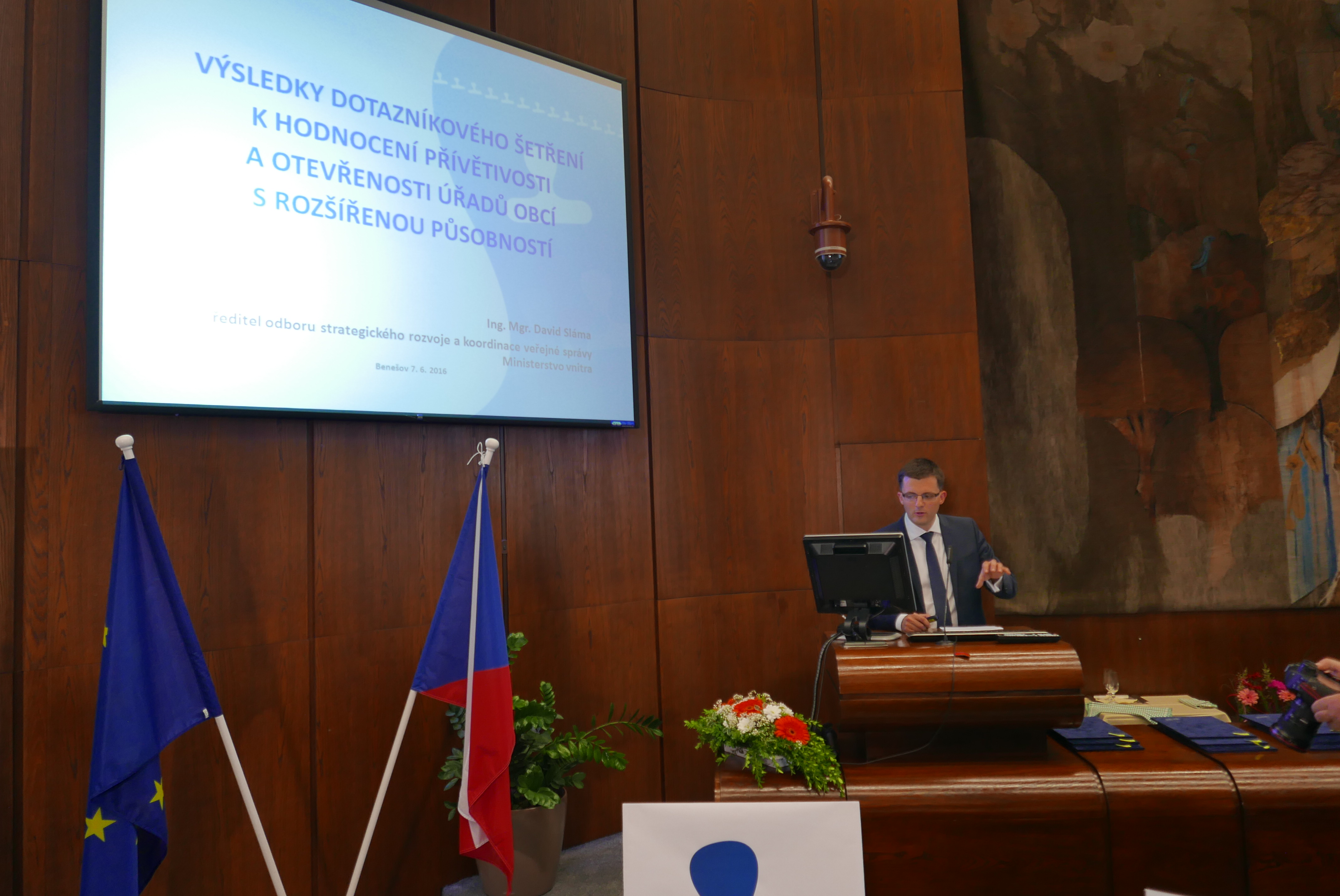 David Sláma, ředitel odboru strategického rozvoje a koordinace veřejné správy, seznamuje přítomné s výsledky dotazníkového šetření
