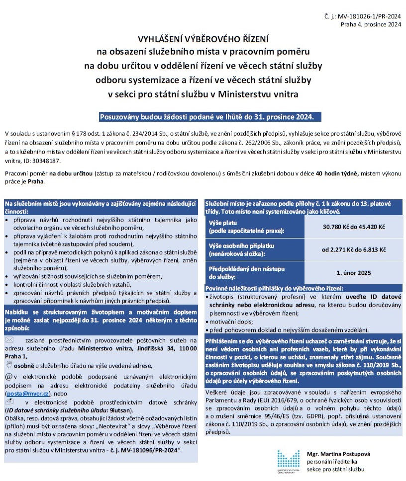 VYHLÁŠENÍ VÝBĚROVÉHO ŘÍZENÍ - na obsazení služebního místa v pracovním poměru na dobu určitou v oddělení řízení ve věcech státní služby odboru systemizace a řízení ve věcech státní služby