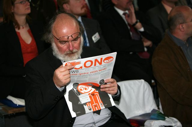 Briefing ministra Pospíšila a Langera Celkový pohled na stánek MV Čtenář eGON news eGON News - zpravodaj o eGovernmentu eGON symbol eGovernmentu a Ivan Langer Chaotické zavádění eGovernmentu před příchodem eGONa Ivan Langer s náměstkem Zajíčkem Konference eVize - prezentace