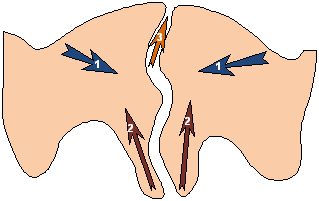Obr. 2 - Schematické znázornění tlakových linií při vzniku papilárních linií: (1) odpověď tono-filamentového systému na (2) a (3); (2) proliferační tlak; (3) stabilizace kanálkem (akrosyringium).- Vznik bříška prstu (6. - 12. týden vývoje) – bříška prstů vznikají na základě geneticky podmíněné diferenciace mezenchymových buněk, které vytvářejí specifické makromolekuly (mukopolysacharid-proteinové komplexy), mající víceméně velkou vazebnou kapacitu pro vodu. Kromě toho působí při vzniku bříšek prstů různé okolní mechanické síly.