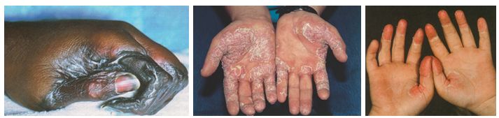 Ekzém/dermatitida ruky – zejména chronické formy se změnami typu psoriaziformní dermatitidy (viz výše).