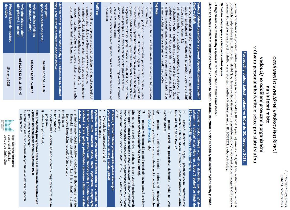 VÝBĚROVÉ ŘÍZENÍ - na služební místo vedoucí/ho oddělení provozní a organizační v útvaru personálního ředitele sekce pro státní službu