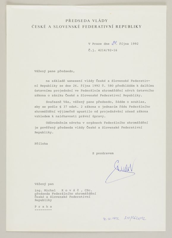 f1 Orlandova adresa.jpg f2 Návrh na vypracování ústavy ČSR.jpg f3 Listina základních práv a svobod jako ústavní zákon.jpg f4 Ústavní zákon o československé federaci.jpg f5 Zánik ČSFR.jpg