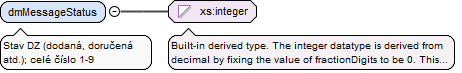 <xs:element name="dmMessageStatus" type="xs:integer"><xs:annotation><xs:documentation>Stav DZ, celé číslo 1 - 9</xs:documentation></xs:annotation></xs:element>