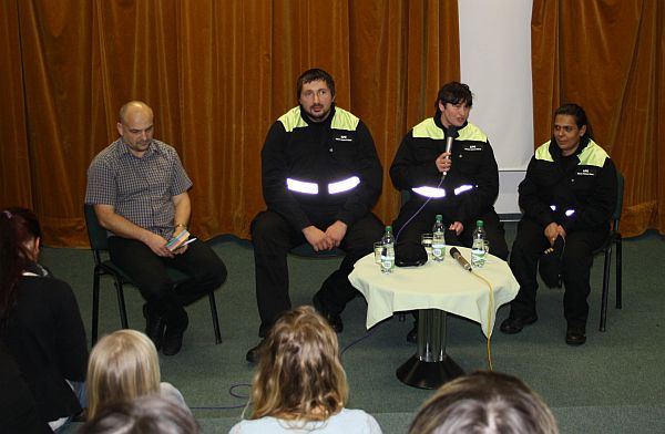 „Dobrý den, dovolte mi, abych mezi námi přivítal naše dnešní hosty,“ ujal se na úvod slova pan učitel Posselt. „Jsou poněkud nervózní, ale není se čemu divit, protože budou besedovat úplně poprvé,“ dodává. Za ním stojí tři uniformované postavy – dvě ženy a jeden muž. V jejich tvářích se opravdu zračí mírné počáteční rozpaky. Zatímco studenti si navzájem sdělují prvotní dojmy, hosté se pohodlně usazují k malému oválnému stolečku do předem přichystaných křesel. Slyšíte? Šum v hledišti utichá, protože všichni jsou zvědaví, co se bude dít dál. „Pan Zahradník, paní Kalejová a paní Klimentová,“ dozvídají se posluchači jména jednotlivých návštěvníků. Po dostatečném představení jejich záslužné činnosti a prolomení počáteční bariéry si mohou páteční hosté na chvíli oddychnout. Ale ne na dlouho. Vzápětí se totiž musí opět chopit mikrofonů, tentokrát již s úsměvem, protože – podívejte – na světě je první dotaz…
