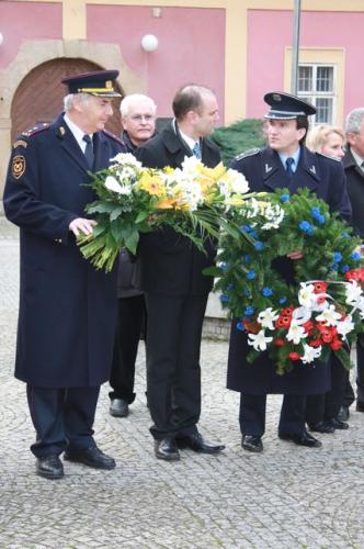 Zleva genmjr. Miroslav Štěpán, ministr Ivan Langer a brig.gen. Oldřich Martinů při kladení věnců v areálu Muzea Policie ČR