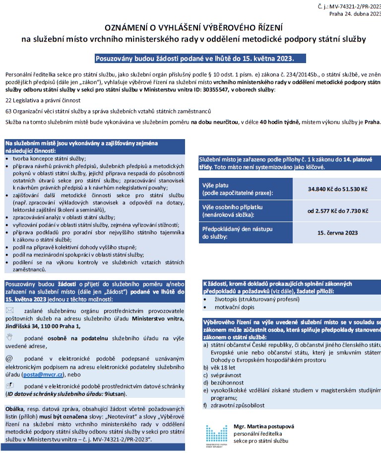 VÝBĚROVÉ ŘÍZENÍ - na služební místo vrchního ministerského rady v oddělení metodické podpory státní služby