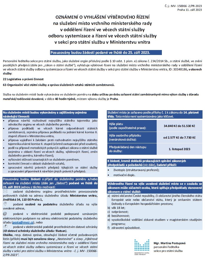 VÝBĚROVÉ ŘÍZENÍ - na služební místo vrchního ministerského rady v oddělení řízení ve věcech státní služby