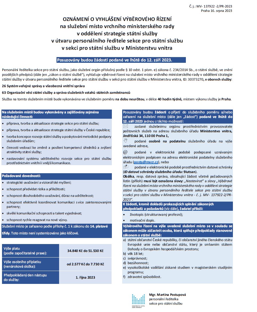 VÝBĚROVÉ ŘÍZENÍ - na služební místo vrchního ministerského rady v oddělení strategie státní služby v útvaru personálního ředitele sekce pro státní službu