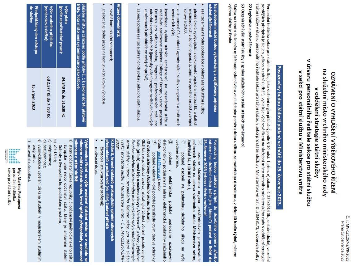 Více informací k výběrovému řízení, včetně vzoru žádosti, a podmínkám výkonu služby na daném služebním místě naleznete na stránkách sekce pro státní službu: odkaz na výběrové řízení.