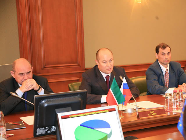 Tisková konference Uvítání na letišti Velkoplošná obrazovka pro krizové řízení Zástupci Republiky Tatarstán